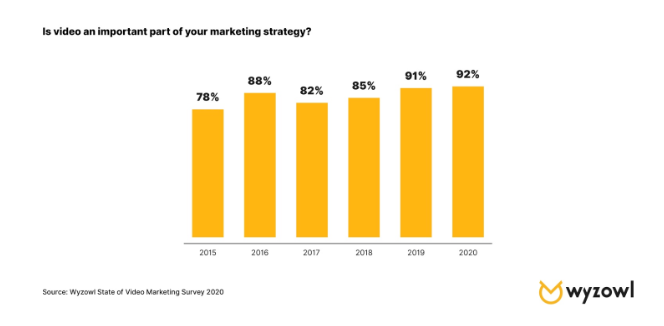 Research by Wyzowl shows 92% of marketers are now using videos as part of their brand marketing strategy.
